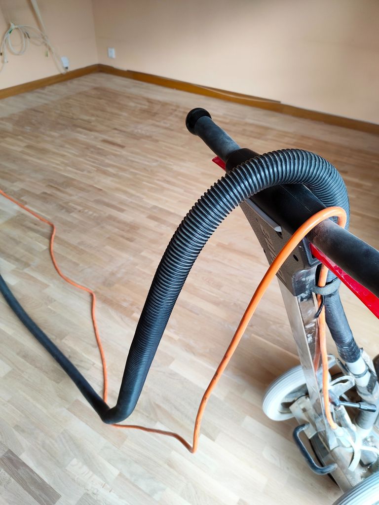 Se retira la resina con lija de grano 60 y se pasan otras dos manos con lija de grano 80 y 100. A continuación se aspira todo perfectamente y ya tenemos el suelo listo para barnizar.
